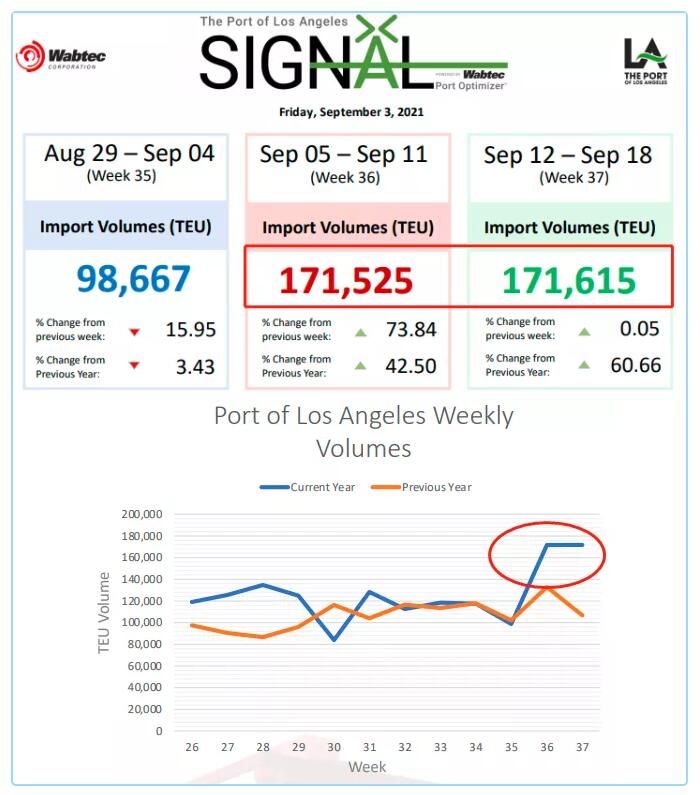 根據洛杉磯港數據,第36周和36周貨量繼續大幅增長(cháng),36周預計大幅增長(cháng)比35周還要增加73.84%,緩解仍不容樂(lè )觀(guān)!