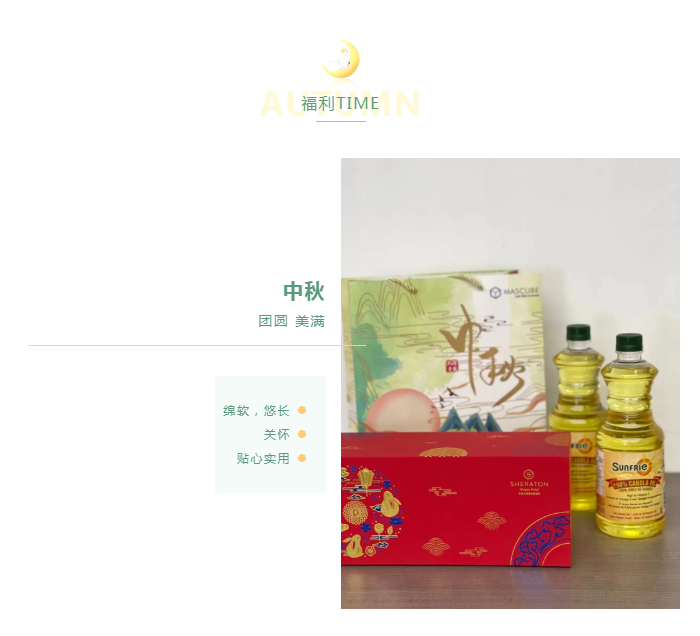 除了豐富的中秋月餅制作活動(dòng)外,公司給每一位美博家人都用心準備了一份中秋禮物:口味多樣的月餅禮盒與實(shí)用的菜籽油。在這中秋佳節里,每位同事都感受到了公司的“家文化”。