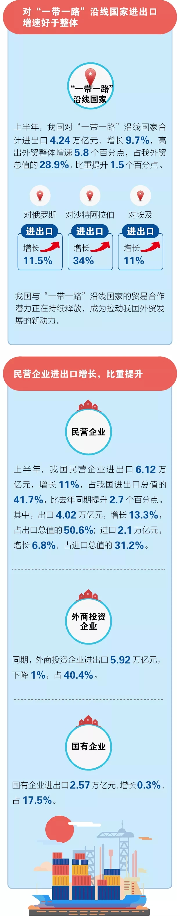 亮點(diǎn)二,外貿內生動(dòng)力不斷增強。民營(yíng)企業(yè)在外貿領(lǐng)域持續發(fā)力,逐漸成為我國對外貿易增長(cháng)的中流砥柱,上半年我國民營(yíng)企業(yè)進(jìn)出口增長(cháng)11%,占比較去年同期提升了2.7個(gè)百分點(diǎn),達到了41.7%,超過(guò)外商投資企業(yè),成為我國外貿第一大主體。