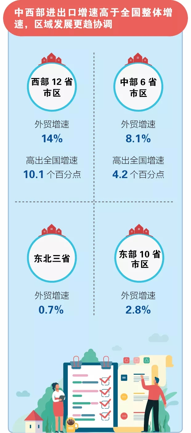 亮點(diǎn)三,區域外貿發(fā)展格局更趨優(yōu)化拓展。近年來(lái),中西部全方位開(kāi)放進(jìn)程加快,承接產(chǎn)業(yè)轉移能力增強,對外貿易加快發(fā)展。上半年,西部12省區市和中部6省進(jìn)出口分別增長(cháng)了14%和8.1%,均明顯高于整體進(jìn)出口增速。京津冀3省市、長(cháng)江經(jīng)濟帶11省市進(jìn)出口分別增長(cháng)3.7%和4%。
