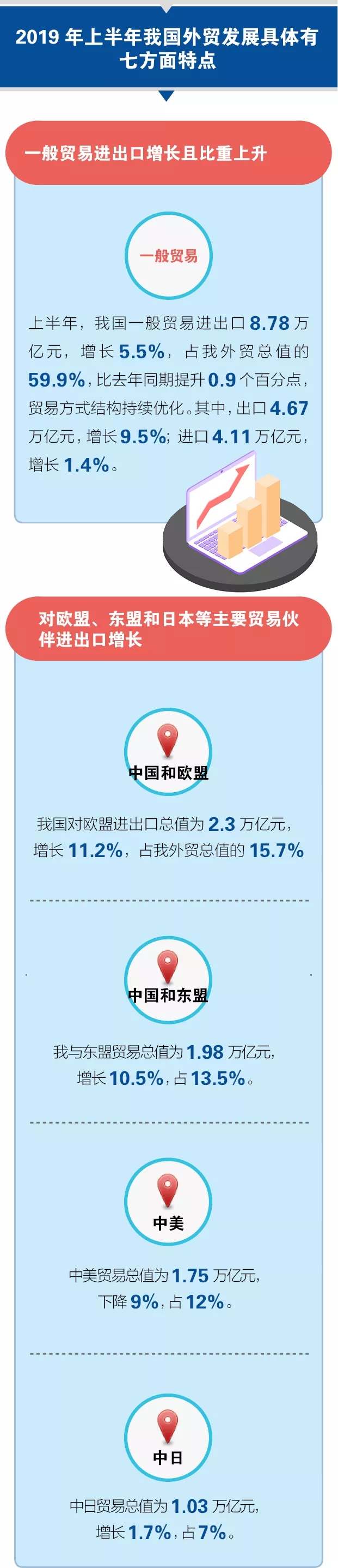 亮點(diǎn)一,貿易方式結構繼續優(yōu)化。上半年,產(chǎn)業(yè)鏈更長(cháng)、附加值更高,更能代表自主發(fā)展能力的一般貿易進(jìn)出口增長(cháng)5.5%,所占比重較去年同期提升了0.9個(gè)百分點(diǎn)。值得一提的是,跨境電商等外貿新業(yè)態(tài)增勢喜人,也給外貿增長(cháng)提供了新動(dòng)能。