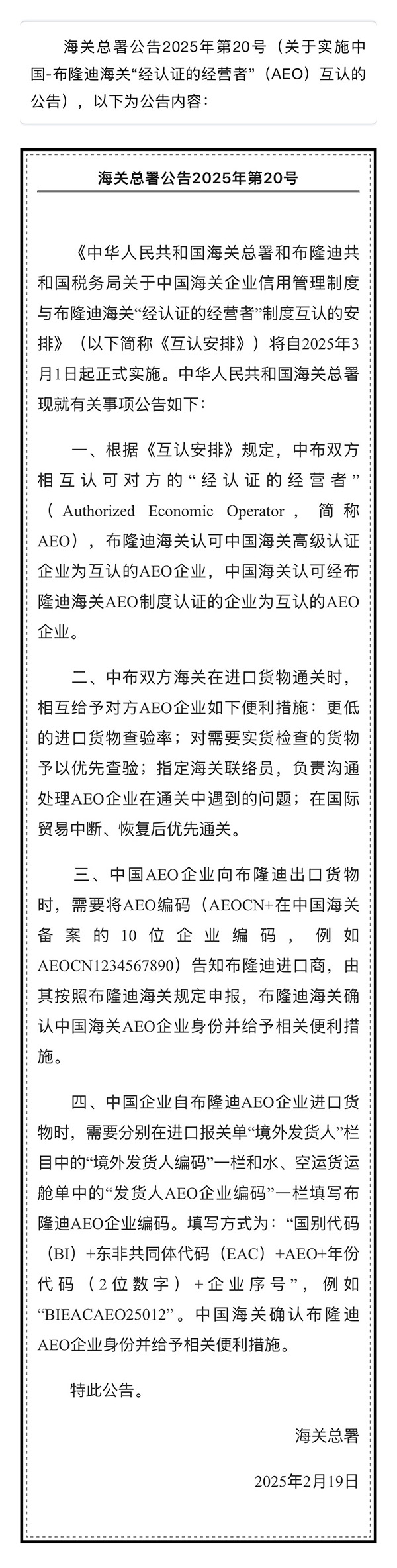 關(guān)于實(shí)施中國-布隆迪海關(guān)“經(jīng)認證的經(jīng)營(yíng)者”(AEO)互認的公告
