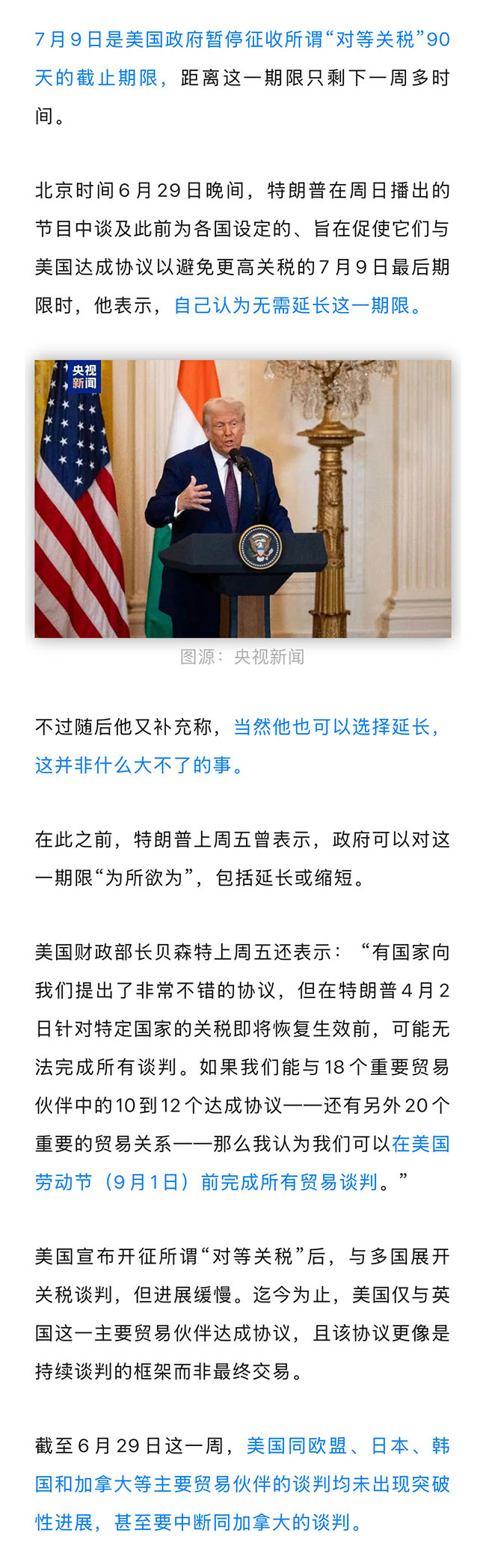 7月關(guān)稅談判截止期將至,特朗普:無(wú)需延長(cháng)