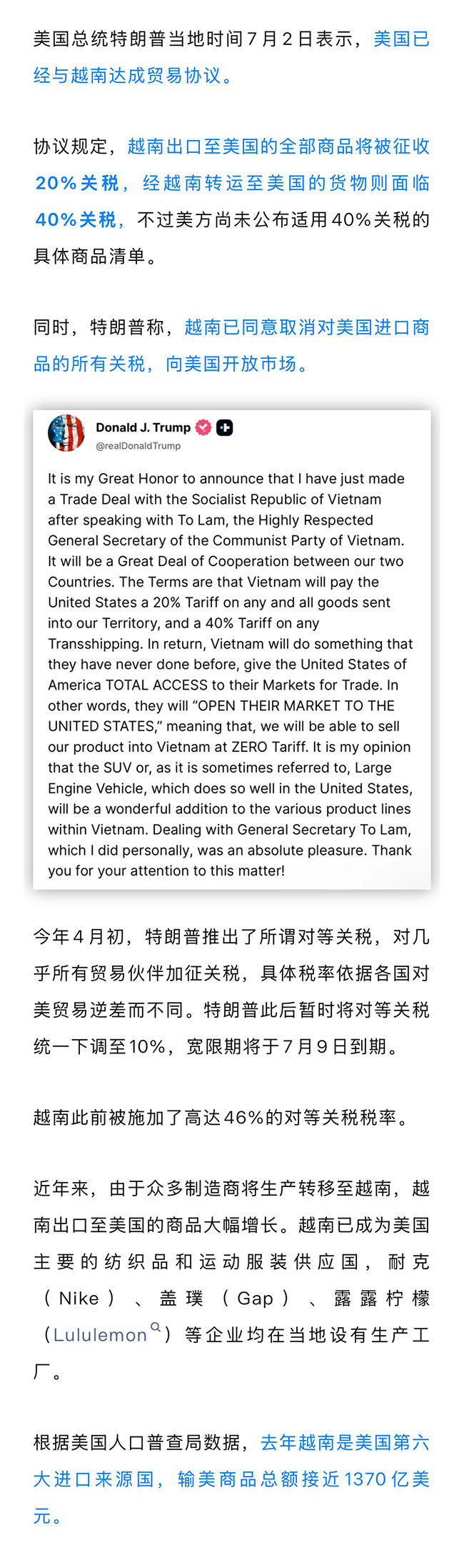 關(guān)稅突發(fā)!特朗普宣布:達成協(xié)議,轉口貨物關(guān)稅40%