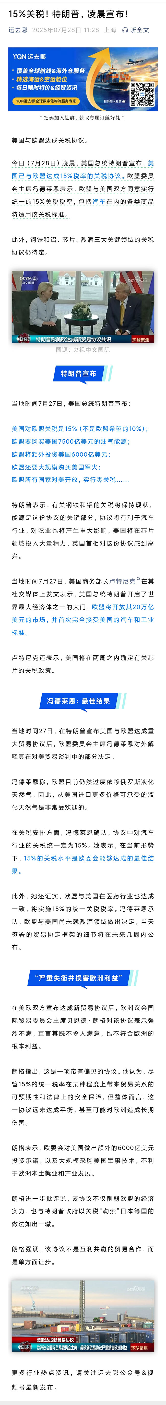 15%關(guān)稅!特朗普,凌晨宣布!