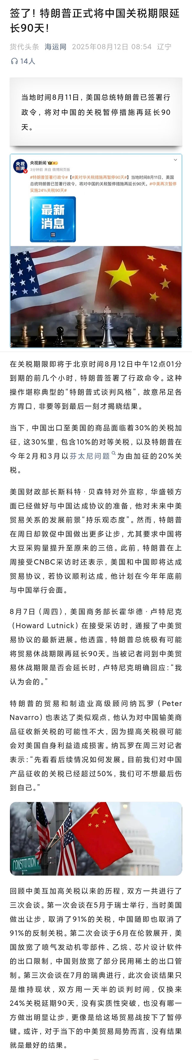 簽了!特朗普正式將中國關(guān)稅期限延長(cháng)90天!