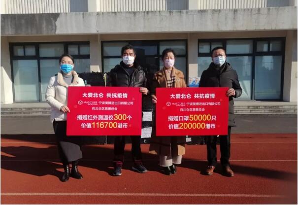 美博集團總裁梅飛珍調動(dòng)各方人脈資源,緊急采購物資,在多方努力下,從國外渠道購入價(jià)值316700港元的口罩50000只和紅外測溫儀300個(gè),不惜成本、爭分奪秒運送至寧波市北侖區慈善總會(huì ),用于支持疫情抗擊前線(xiàn),為新型肺炎的一線(xiàn)疫情防控筑起“健康堡壘”。